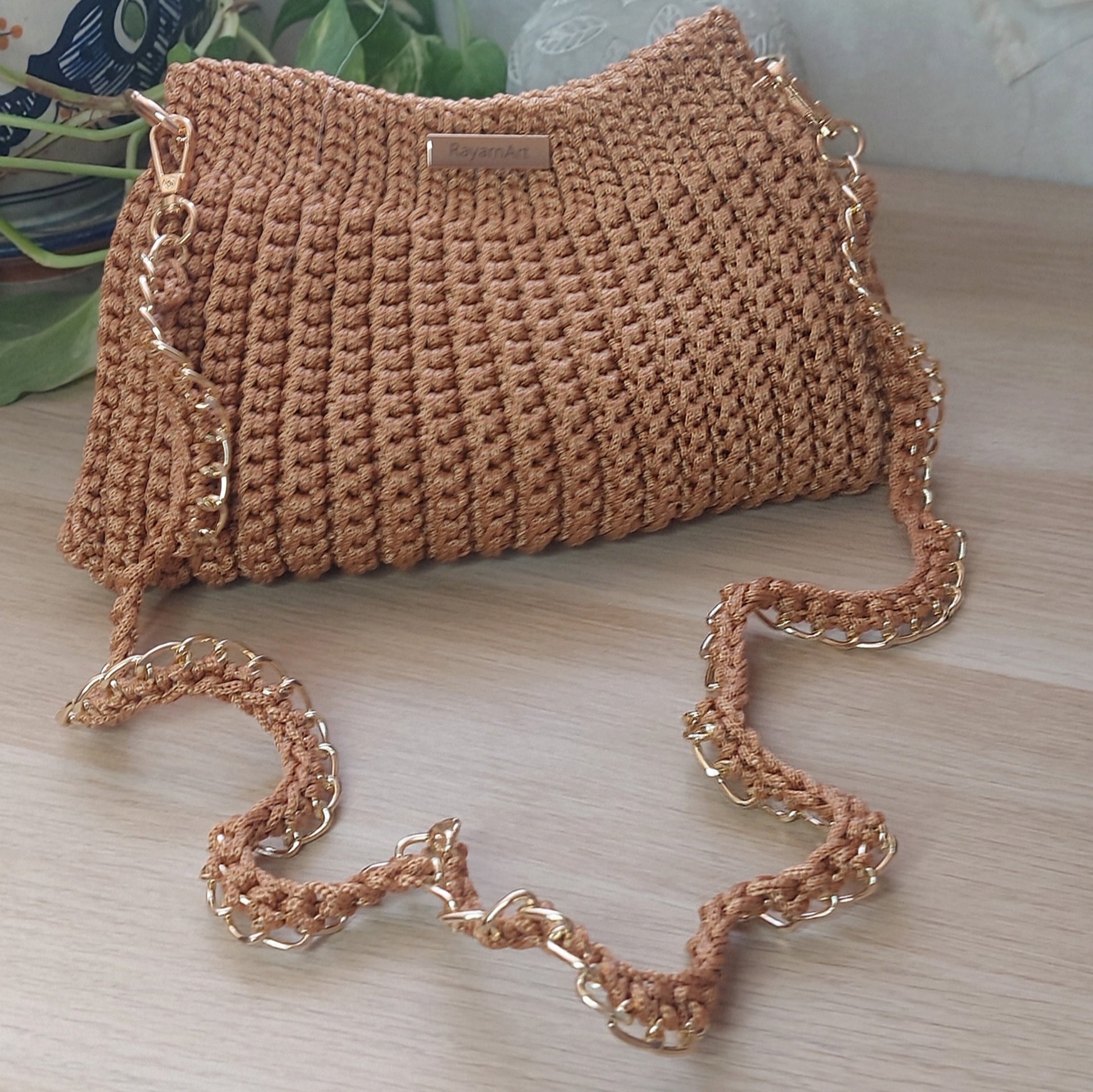 Inspired by the beauty of the coast, these handmade crochet bags boast a charming sea shell-like design. Available in lovely shades of pearly white, gentle light mauve, and vibrant autumn yellow, each bag is completed with a chic metal gold chain strap featuring a unique crocheted yarn border, blending metal and yarn seamlessly. A unique and artful accessory for any occasion. Measurements approximately: 25 cm W x 16 cm H.